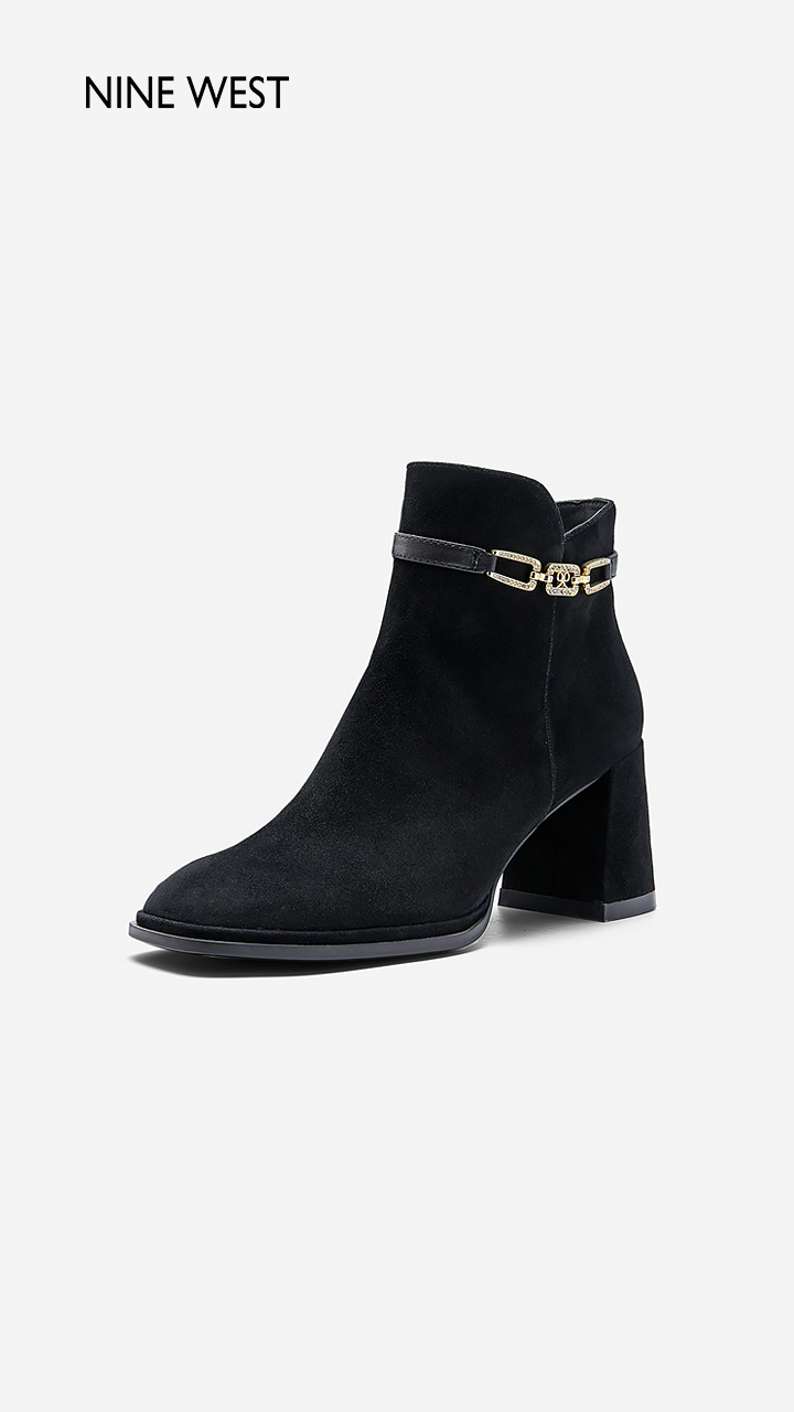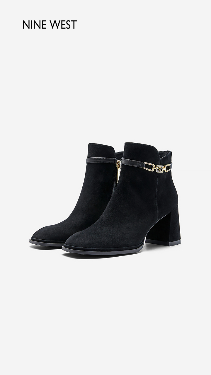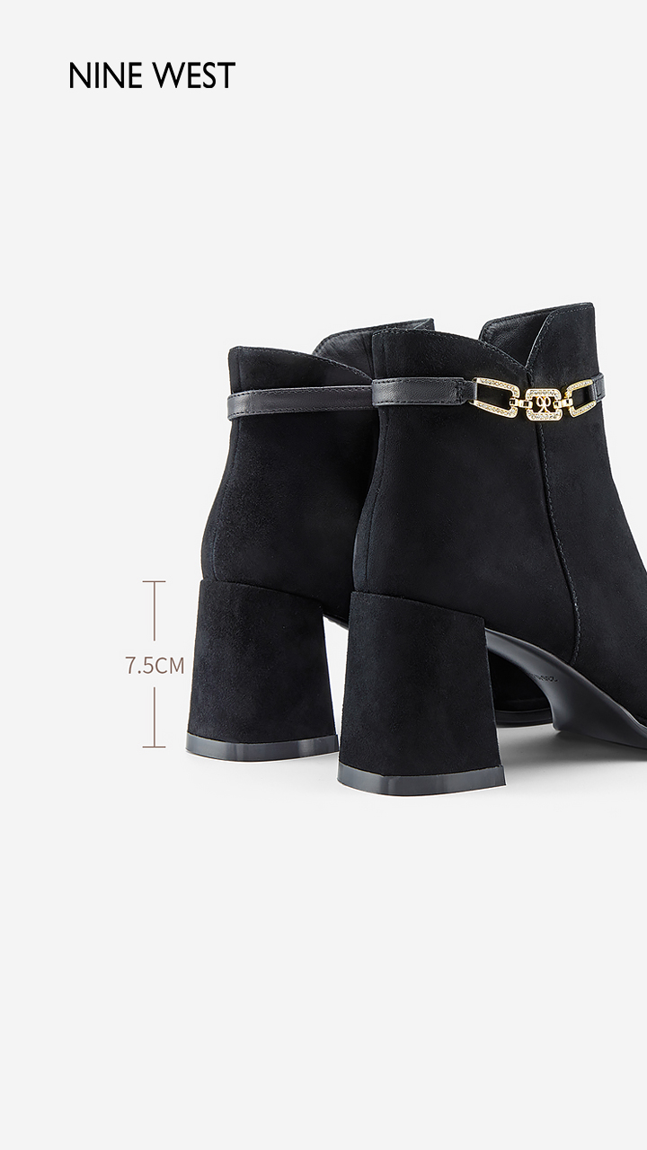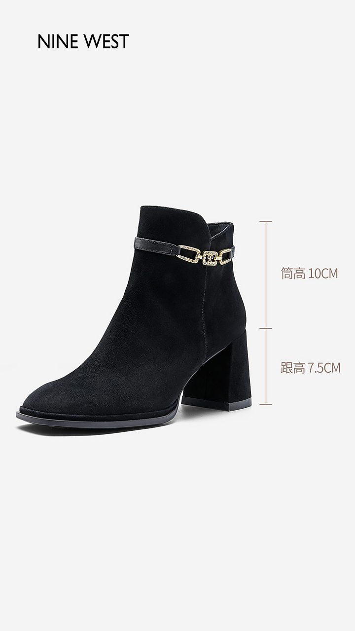 Nine West/玖熙99钻链反绒法式优雅短靴2023冬新款复古粗跟时装靴