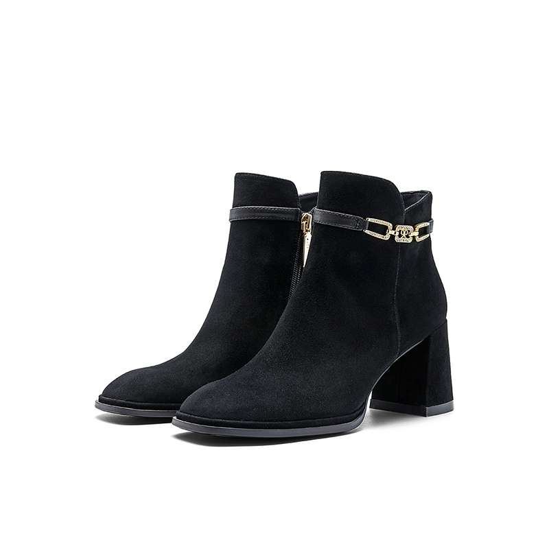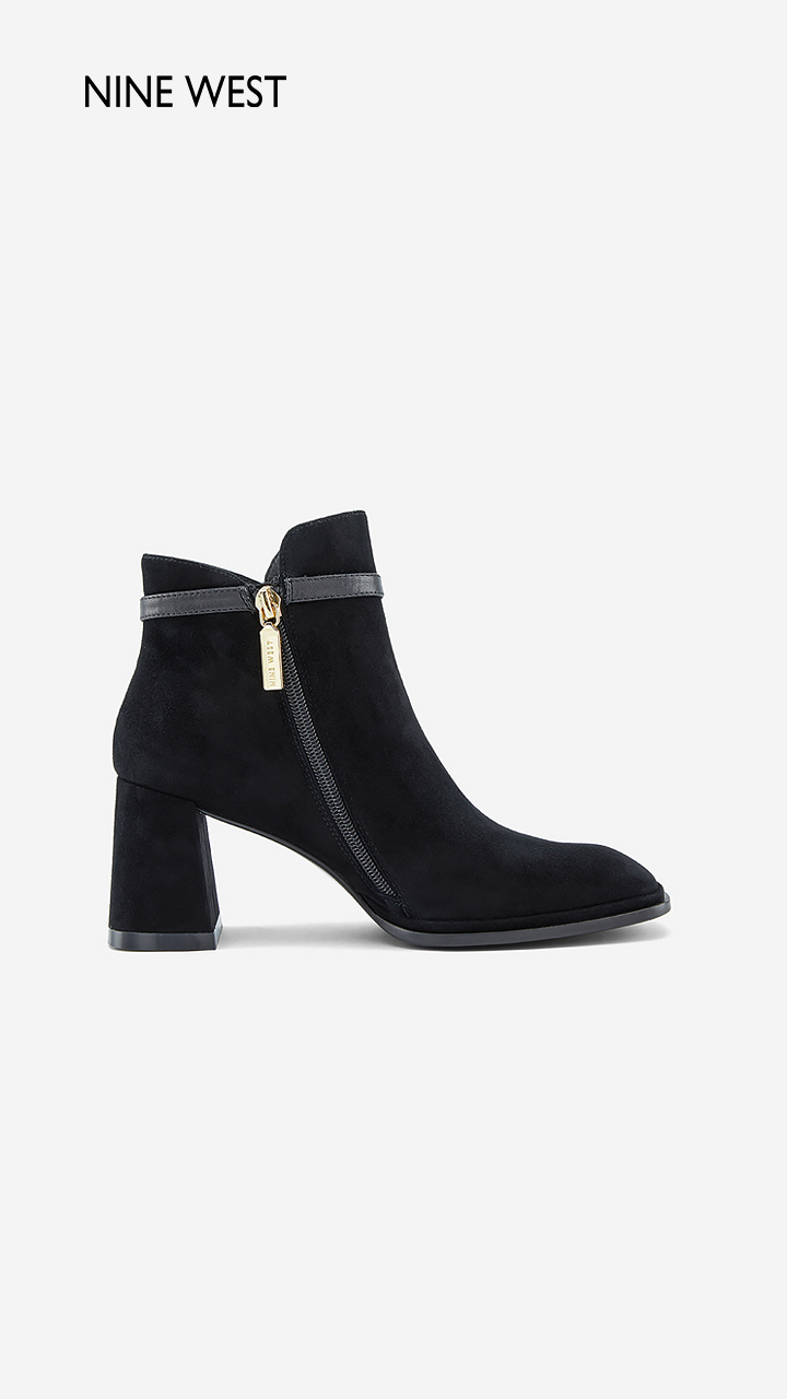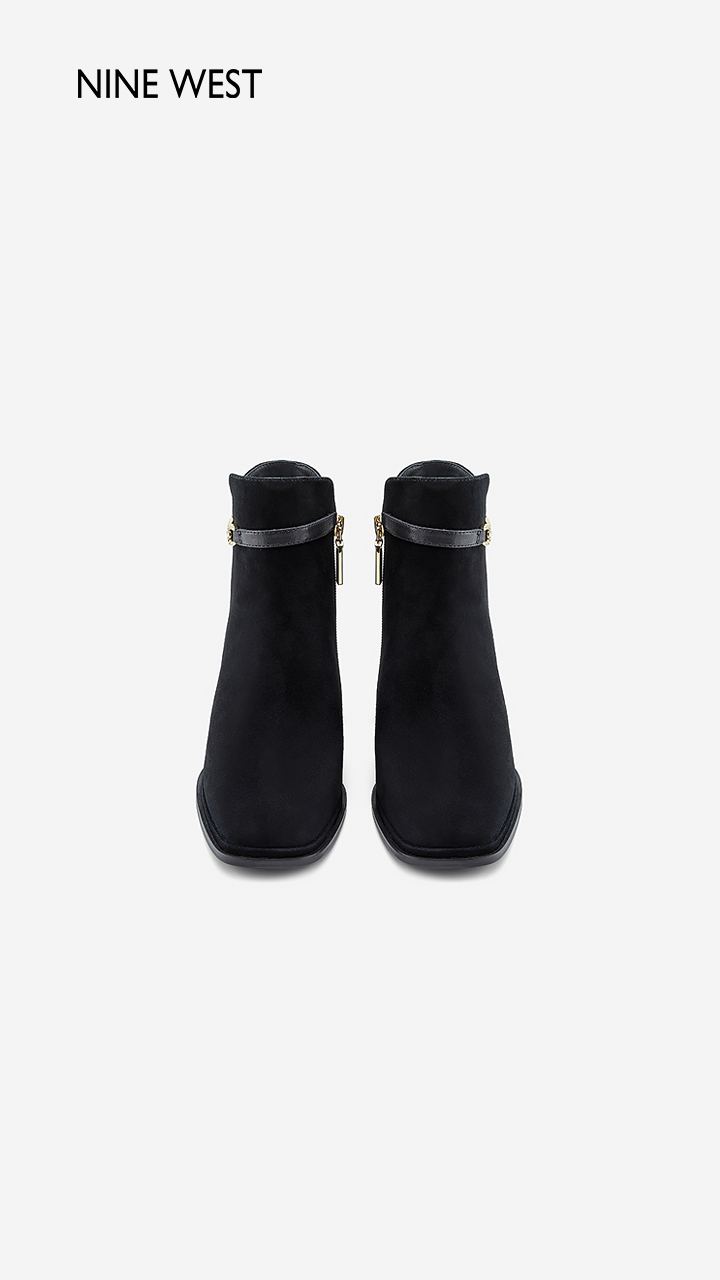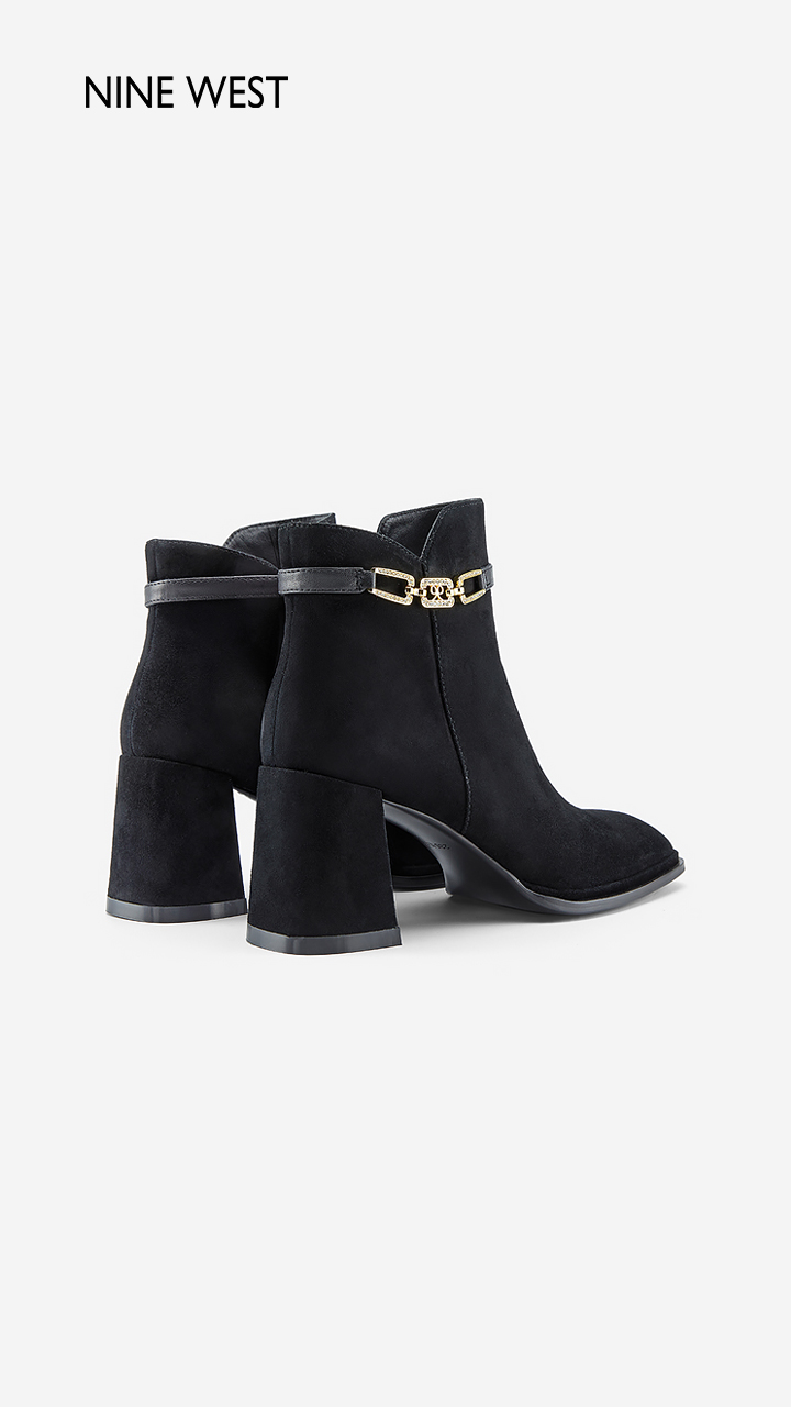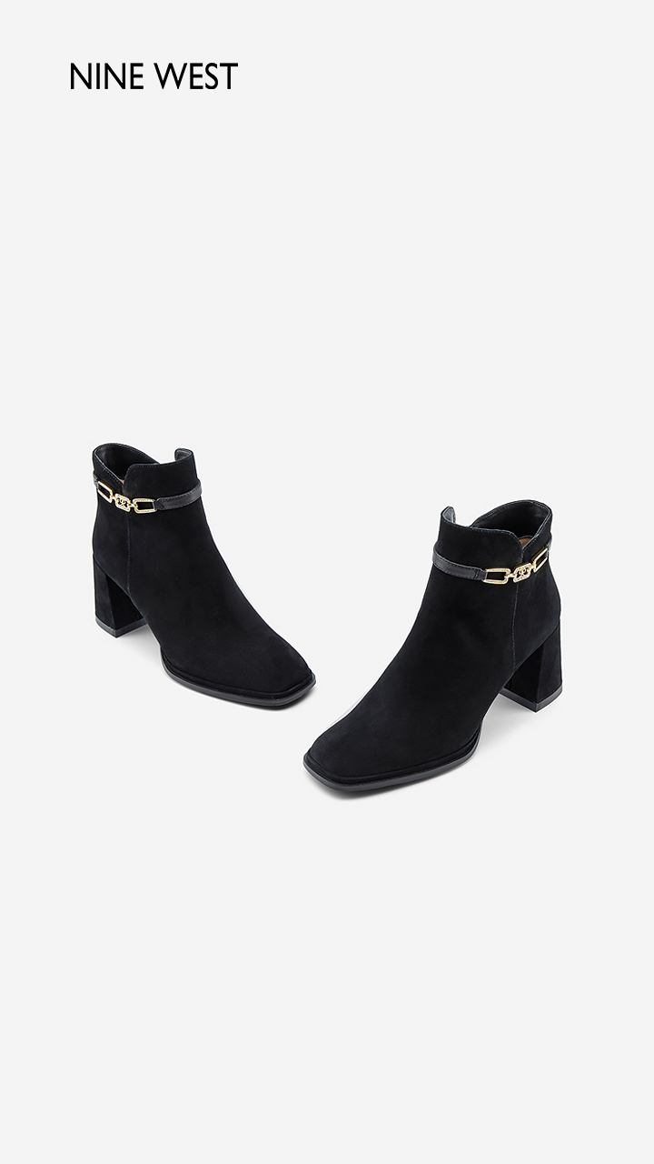 Nine West/玖熙99钻链反绒法式优雅短靴2023冬新款复古粗跟时装靴