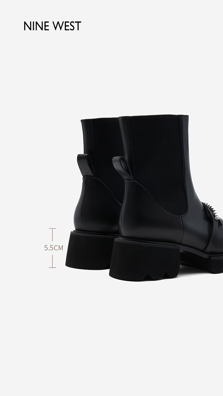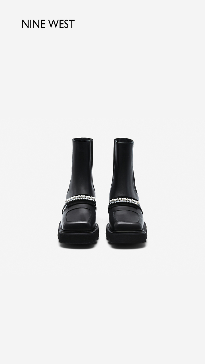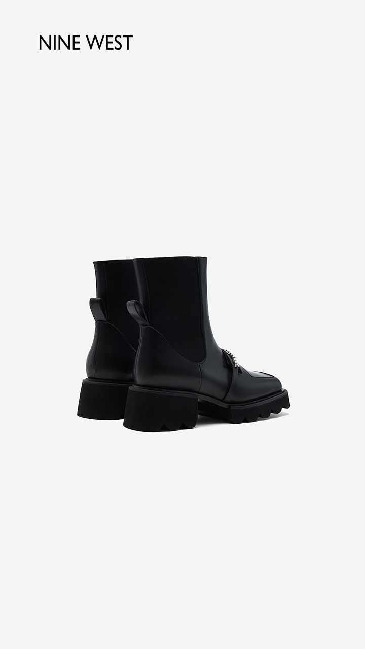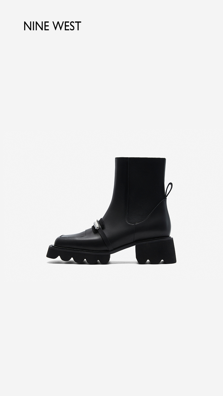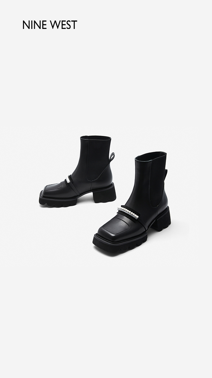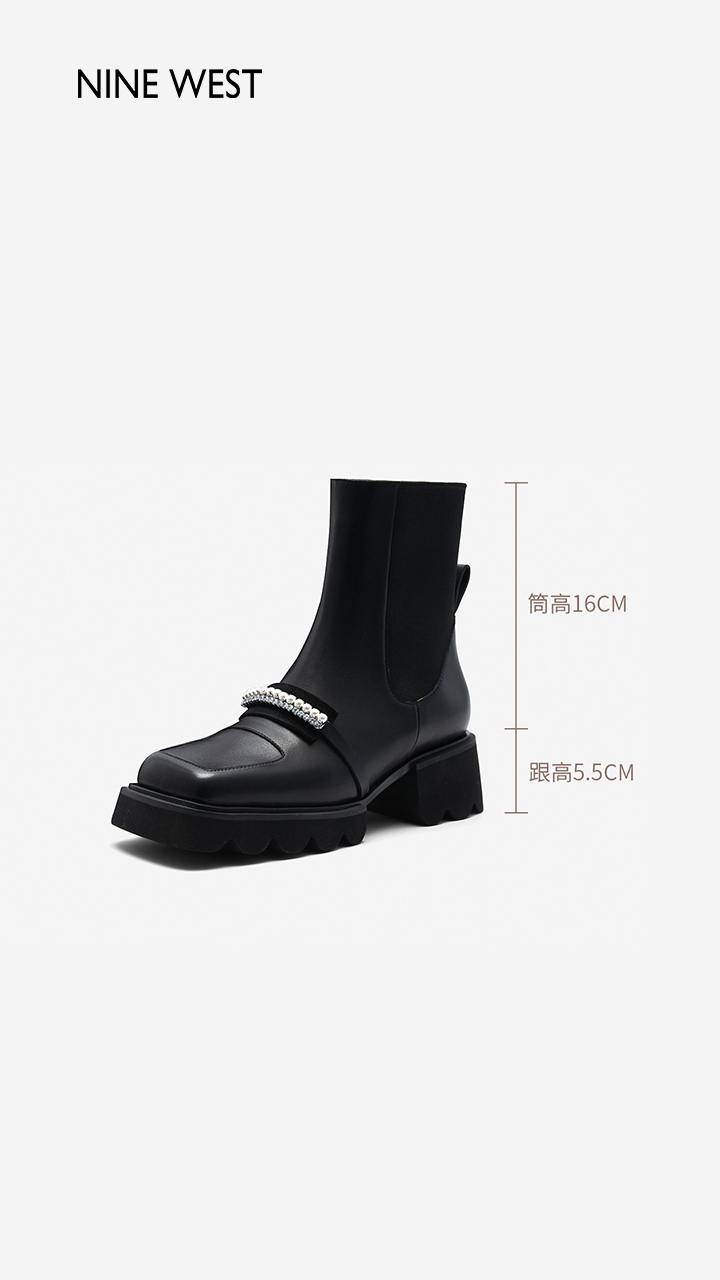 Nine West/玖熙珍钻小众甜酷短靴2023冬新款方头弹力厚底切尔西靴